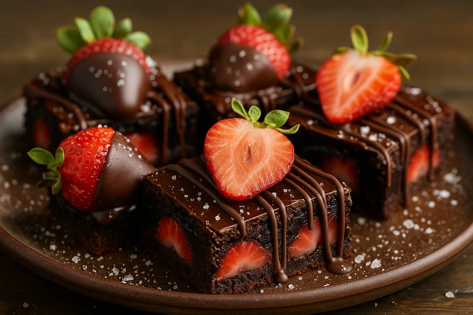 Use high-quality chocolate for both brownies and ganache for best flavor. For extra fudginess bake a few minutes less. Add a tablespoon of espresso powder to the batter to deepen chocolate flavor. Substitute white chocolate ganache and drizzle over strawberries for contrast. To make ahead, store brownies chilled up to 3 days or at room temperature 24 hours; warm slightly before serving if desired.