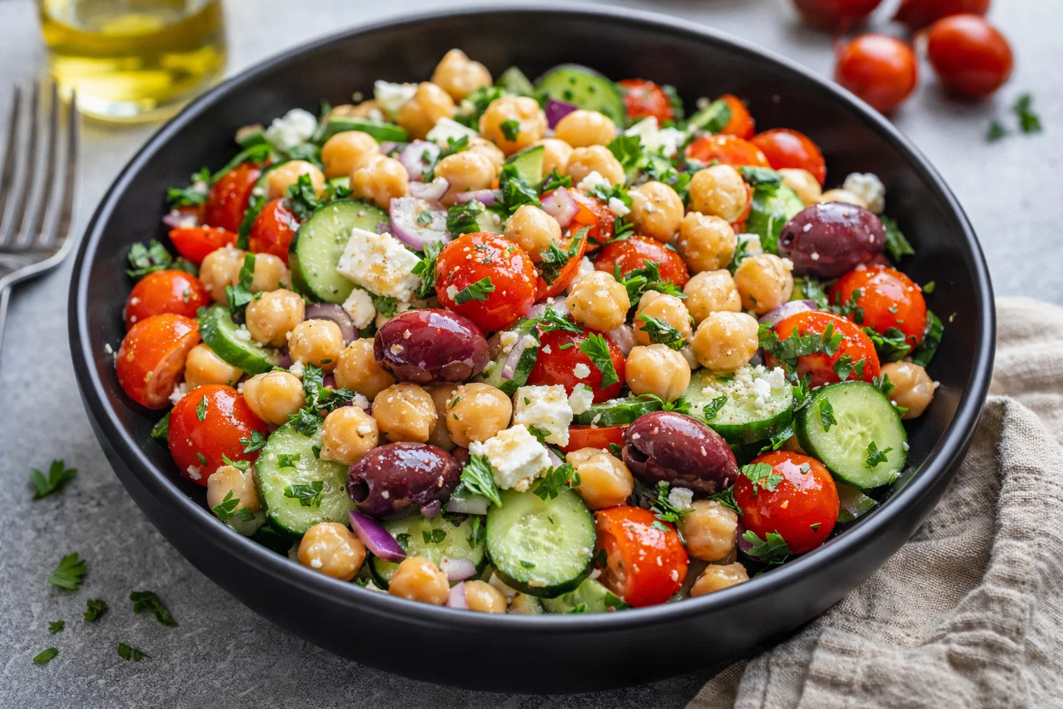 Combine Ingredients: In a large mixing bowl, combine the chickpeas, chopped cucumbers, halved cherry tomatoes, red onion, bell pepper, olives, and parsley. Doing this helps blend the flavors from the very beginning.