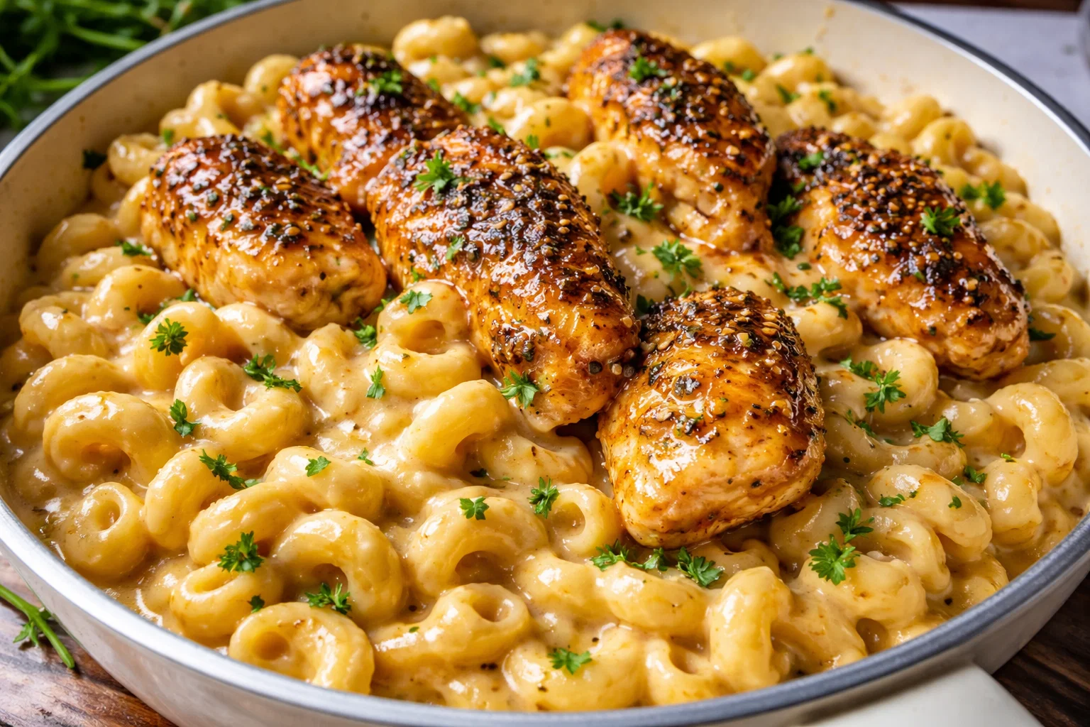 9. Serve: Remove from the oven and let it cool for a few minutes. Portion into bowls, garnish with fresh herbs if desired, and enjoy your homemade Honey Pepper Chicken Mac and Cheese!