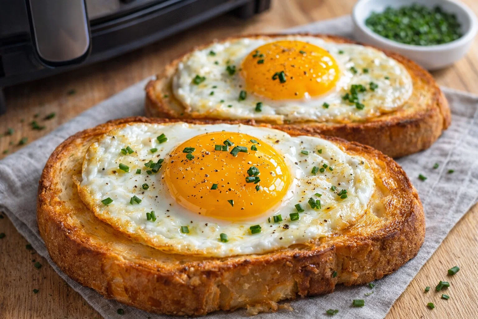 Cook/Bake: Place the assembled toast back into the air fryer basket and cook at 320°F (160°C) for 8-10 minutes. Keep an eye on it to ensure it doesn’t overcook. The final product should be perfectly cooked with melted cheese and a fluffy egg topping.